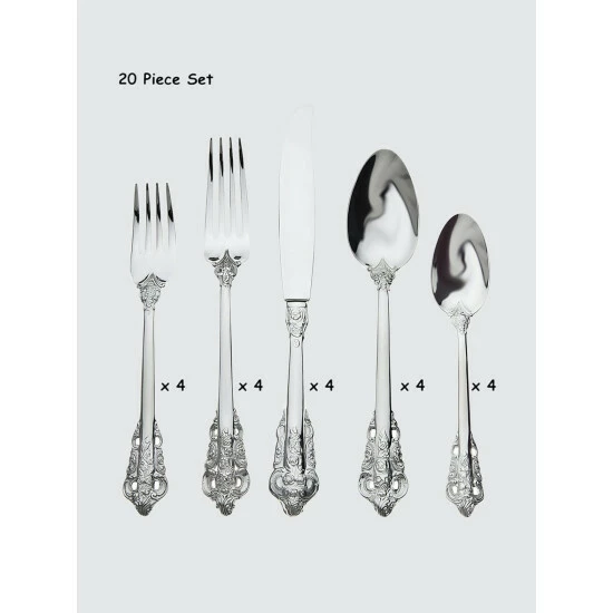 This Baroque-inspired flatware set features pierced scrolling garland accents.