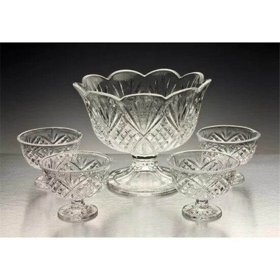Godinger is a unique company that specializes in handmade silver, pewter, crystal and elite gift items. From wedding gifts, candlesticks, barware, bakeware, tea sets and frames, you are sure to find the ideal item for any special occasion. Godinger’s goal is to provide you the customer, with a piece that expresses a ”one of a kind” sense of style and quality at affordable prices. Footed and faceted, this Dublin dessert set adds instant refinement to any dessert or salad course. The large serving bowl and four individual bowls are all fashioned with the same lovely silhouette, star burst design and scalloped rim. A great choice for fruit salad and layered confections, this set coordinates with the extensive line of Dublin dishes and should be washed by hand for best care.