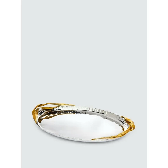 A uniquely crafted crumpled leaf design adorns this beautiful tray. This piece is a perfect and practical addition to your serving tools and can be used to add some flare to all decor styles. The gold accent along with the elegant design make this piece stand out on any table.