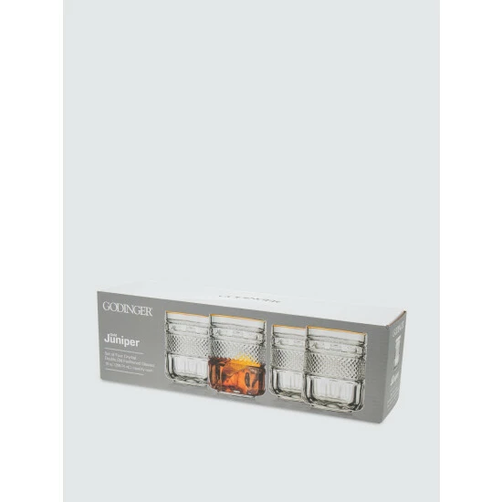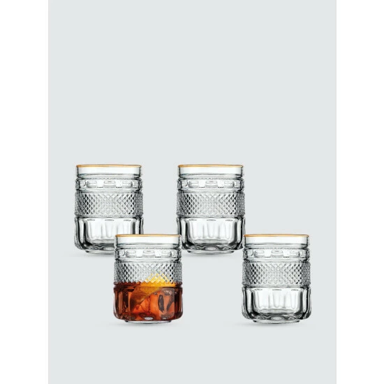 A classic glassware shape featuring a gold rim and raised texture detailing make this a standout addition to your cabinets. This will be your go-to glassware for special guests.
