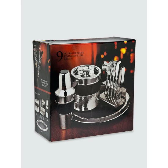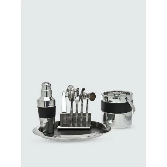Complete your home bar ensemble with this essential design. Hammered stainless steel accented with black leather make this bar set perfect for hosting guests.
