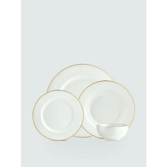 With a gleaming gold rim and textured shapes in bone china, this chic dinnerware creates a tablescape of effortless elegance.