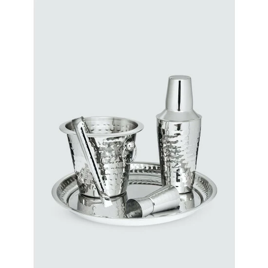 This stainless steel Hammered Bar Tool Set comes with a tray, ice bucket, ice tong, cocktail shaker, and double jigger.