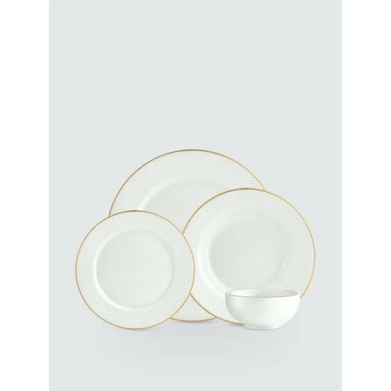 This porcelain dinnerware set is adorned only with a simple gold rim and a textured band for an understated, timelessly chic look.