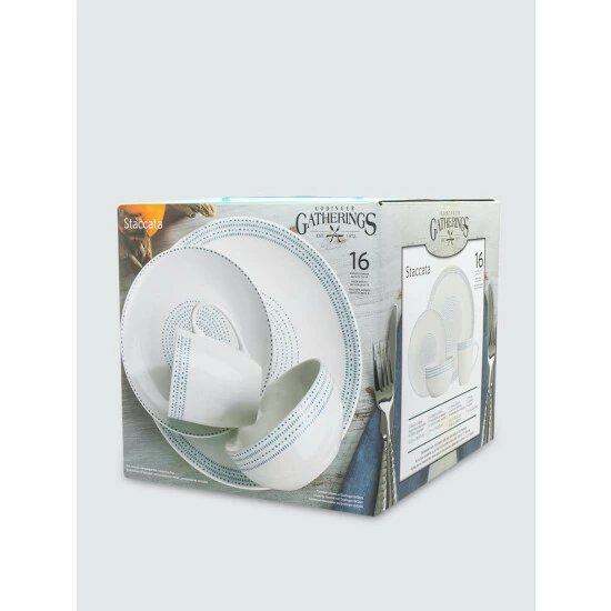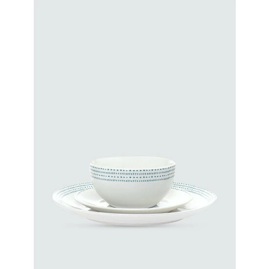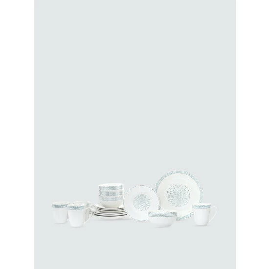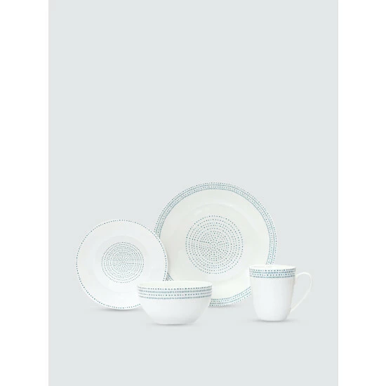 This set is a clean and classic take on a modern farmhouse table setting. Crafted of durable stoneware, each piece is finished with a banded circle of azure blue dots, a versatile design that lends its charm to both casual meals and special occasions.