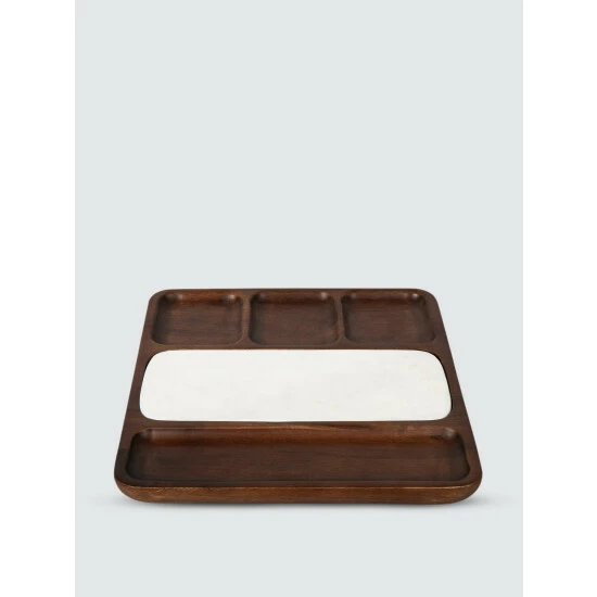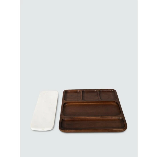 This platter was handcrafted from polished white marble and natural acacia wood, a versatile design perfect for parties and gatherings.
