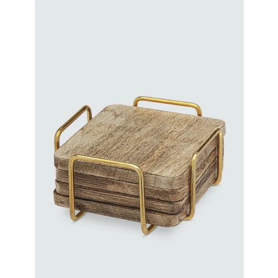 This Godinger set features four natural acacia wood coasters that are sanded and finished with a food-safe oil. They are stored in a distressed wrought iron holder, creating the perfect farmhouse look for this coaster set.